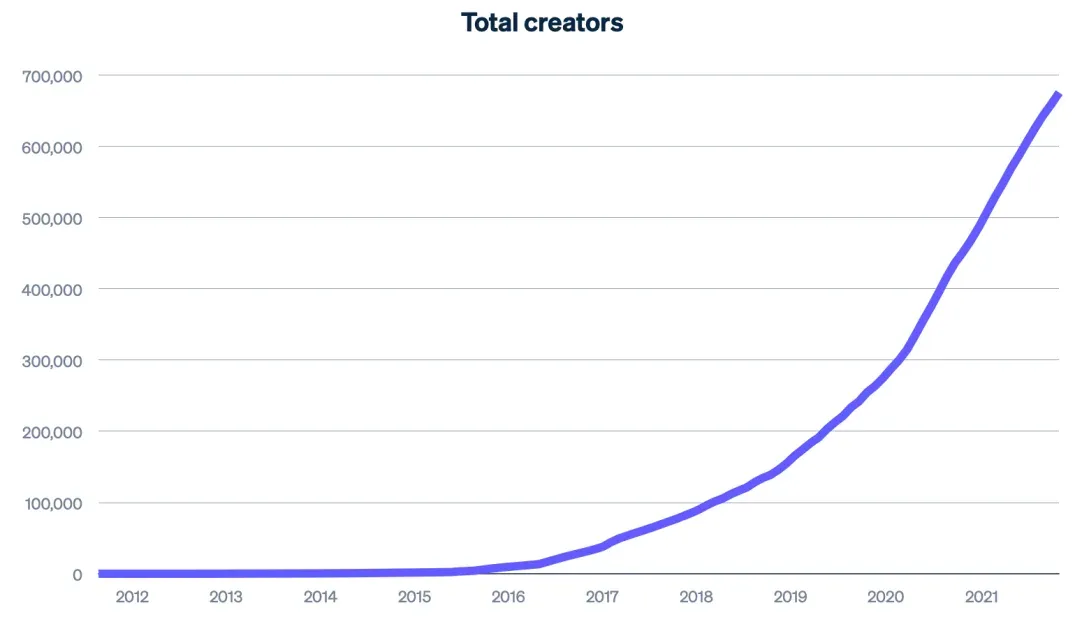 - In 2021, total number of creators onboarded by apps using Stripe has grown 48% year over year.